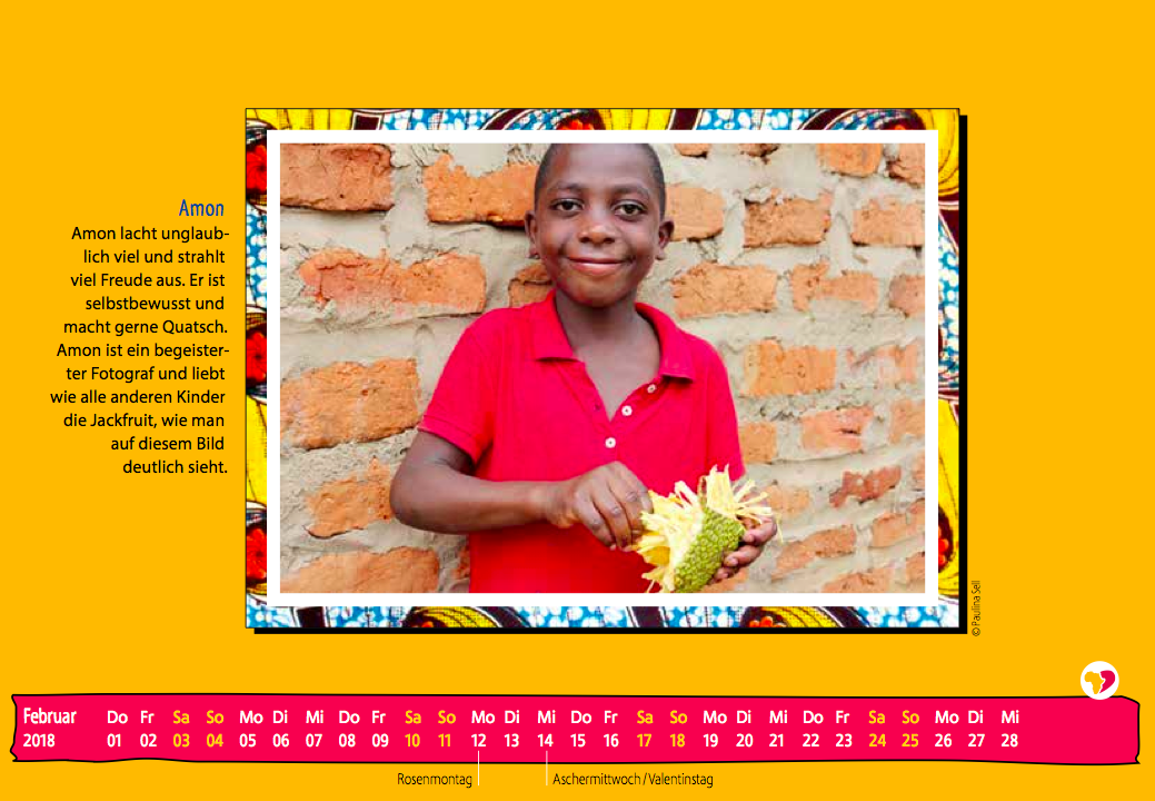 Mit dem Kalender bereiten Sie den Beschenkten eine Freude mit tollen Fotos und Geschichten zu unseren Schützlingen. Und Sie unterstützen unsere Kinder, die dank Ihrer Hilfe glücklich und rundum versorgt sind. Die 10€ pro Kalender kommen zu 100% unseren Kindern in Uganda zugute.