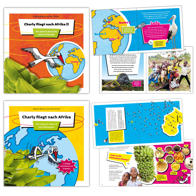 In Teil I macht sich der kleine Storch Charly im Herbst auf den Weg nach Afrika und landet auf dem Strohdach einer Hütte in Mbale, in Uganda in Ostafrika. Dort entdecken ihn unsere Kinder und Charly begleitet diese einen Tag lang. In Teil II besucht Charly Storch Favour, Amon und all die anderen Kinder in Uganda. Seine Freundin Luna Langbein begleitet Charly auf seiner Reise. Gemeinsam treffen sie neue Freunde, erfahren, wie man Fußball und Springseil selber bastelt, und lernen Ugandas Tierwelt kennen.